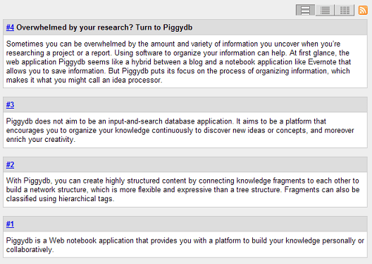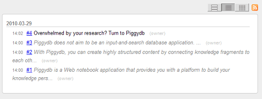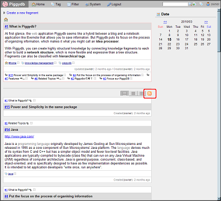 Posted: March 15, 2010 Filed under: uncategorized Leave a commentThis release adds Atom feeds for knowledge fragments, such as a feed for fragments with a specific tag. The feeds are available on home.htm, tag.htm, filter.htm, and user.htm.
