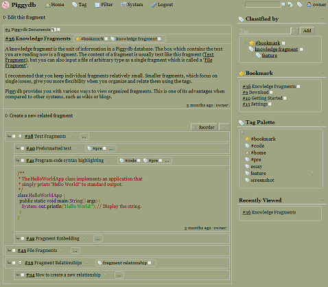 Posted: April 29, 2011 Filed under: uncategorized Leave a commentPiggydb user Jerome J. Slote kindly shared his tips for modifying the existing look and feel of Piggydb, and moreover, an interesting way of extending the text formatting beyond the wiki markup set.
