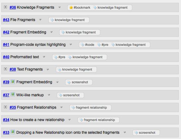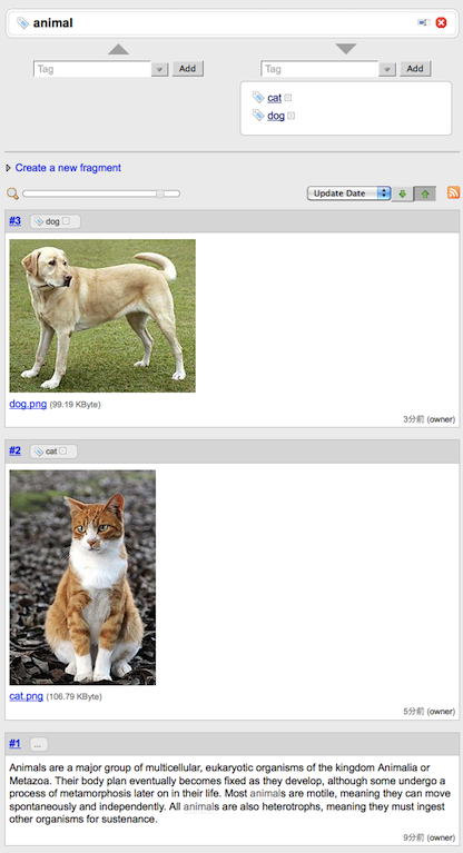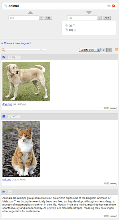 Hierarchical tagging allows you to classify a tag through other tags, exactly like knowledge fragments, and the classification is transitive; that is, if there is a tag “cat” classified with a tag “animal” and you classify some fragments with “cat”, then those fragment will be classified as an “animal” also. The hierarchical tagging feature allows you to classify fragments more naturally, and drill down a large number of fragments more easily and smoothly.