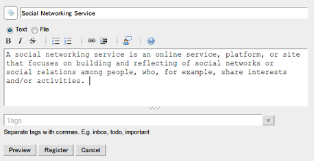 An important theme of Piggydb is how it encourages users to create their own tag cloud based on their knowledge fragments, not on their known system of classification. This goal isn’t impossible to achieve with the current version if there are some instructions, but I believe that it is meaningless unless a software itself has an affordance to convey its philosophy to users.