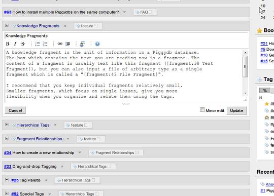 The most important feature of Piggydb is ‘tags’. However, you may not need them if you use Piggydb as an organizable notebook. Actually when I used it in the recent work to manage the project related information, I did not use tags at all except the system tags (#home, #bookmark, etc). Just connecting fragments was sufficient to manage the information (multi-parenting perfectly worked to organize the complex information). Heavy users may have realized that the roles of fragment relationships and tags are overlapped because both have similar functionalities in terms of ‘grouping’ fragments. So if you just need to organize information on your daily life or work, it would be sufficient to use only either of them.