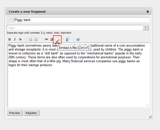 After the selected file is saved into the database, embedding markup will be inserted automatically as below: