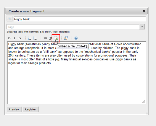 Posted: July 11, 2012 Filed under: uncategorized Leave a commentThis release adds a new “Embed a file” tool button to the fragment editor toolbar: