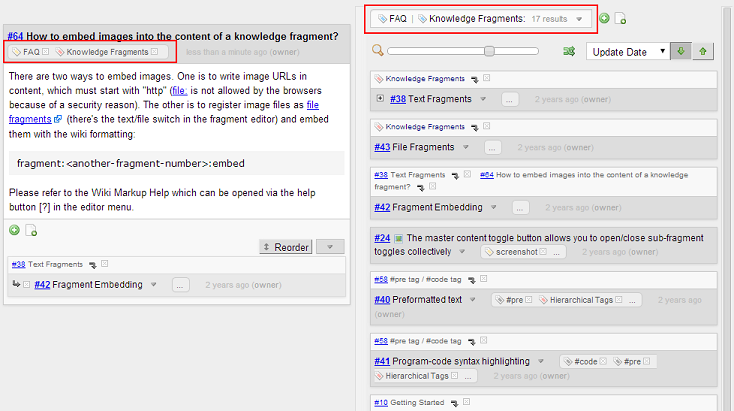 The ‘Any’ tag search produces another feature called “related fragments”. In the fragment page, the list view displays all the fragments tagged with any of the tags of the focused fragment: