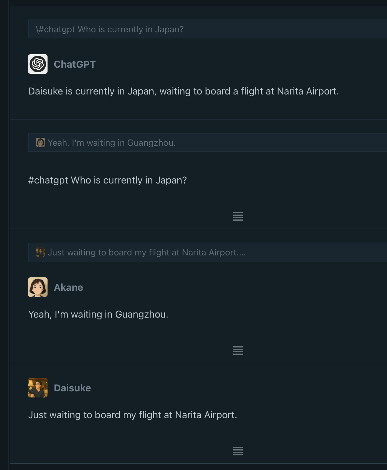 The second unique feature is that the ChatGPT plugin can recognize the authors of each Coto included in the context. This allows it to answer questions about who said what. It’s particularly useful in situations that involve group discussions.