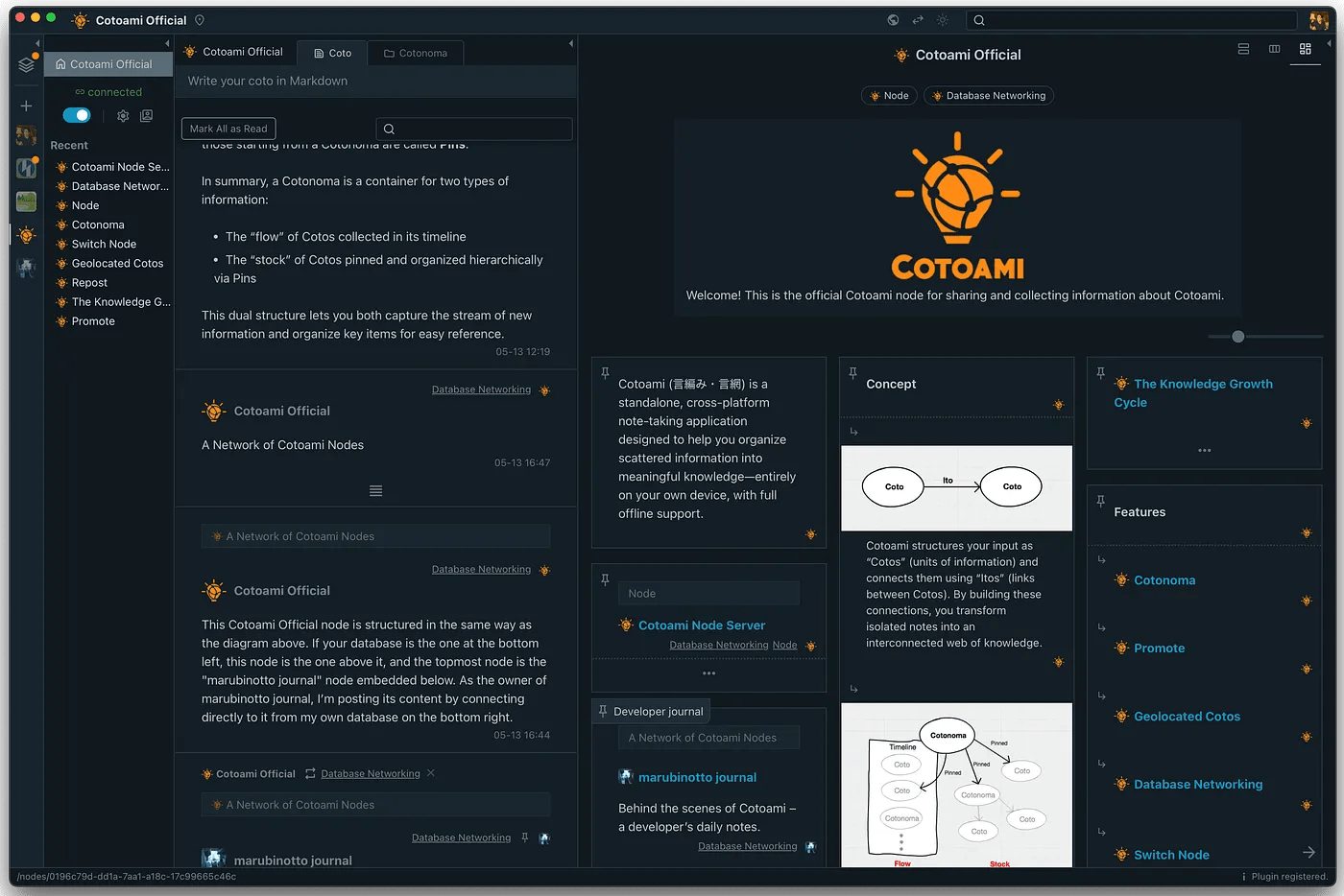 I’ve written a Getting Started guide for Cotoami, walking you step by step from installation to the basics of how to use it. The guide also introduces Cotoami’s proposed method for knowledge creation, the PPCP (Post/Pin/Connect/Promote) Cycle, explained with real examples. This method represents one of the conclusions I’ve reached about how to cultivate a knowledge base, an exploration that goes back to the Piggydb days.