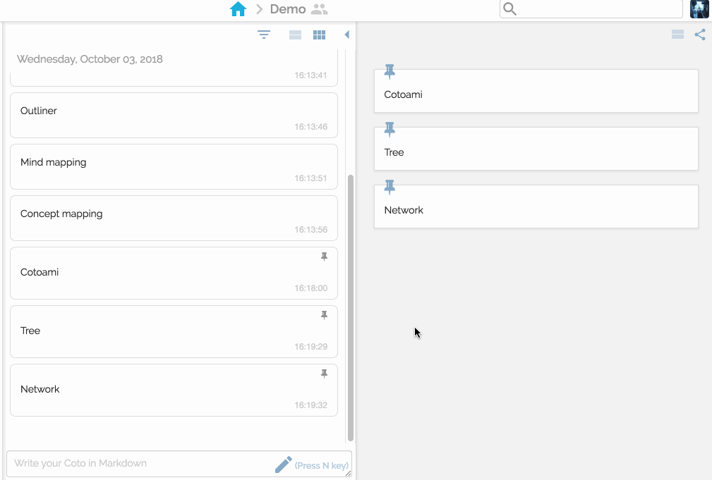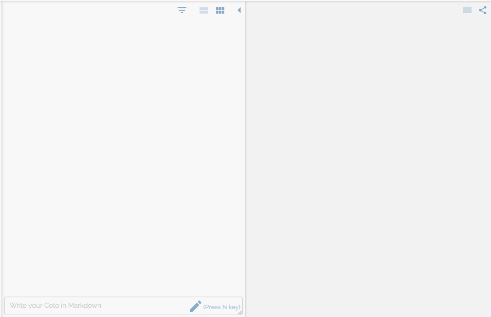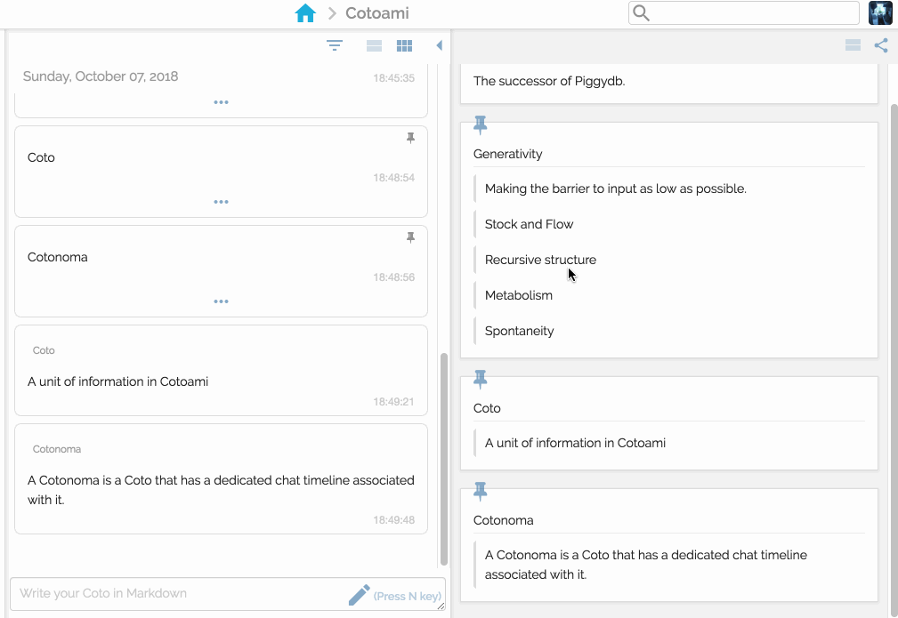 In Cotoami, individual posts are called “Cotos”, which is a Japanese word meaning “thing” and there’s a special type of Coto called “Cotonoma” (Coto-no-ma means “a space of Cotos”). A Cotonoma is a Coto that has a dedicated chat timeline associated with it.
