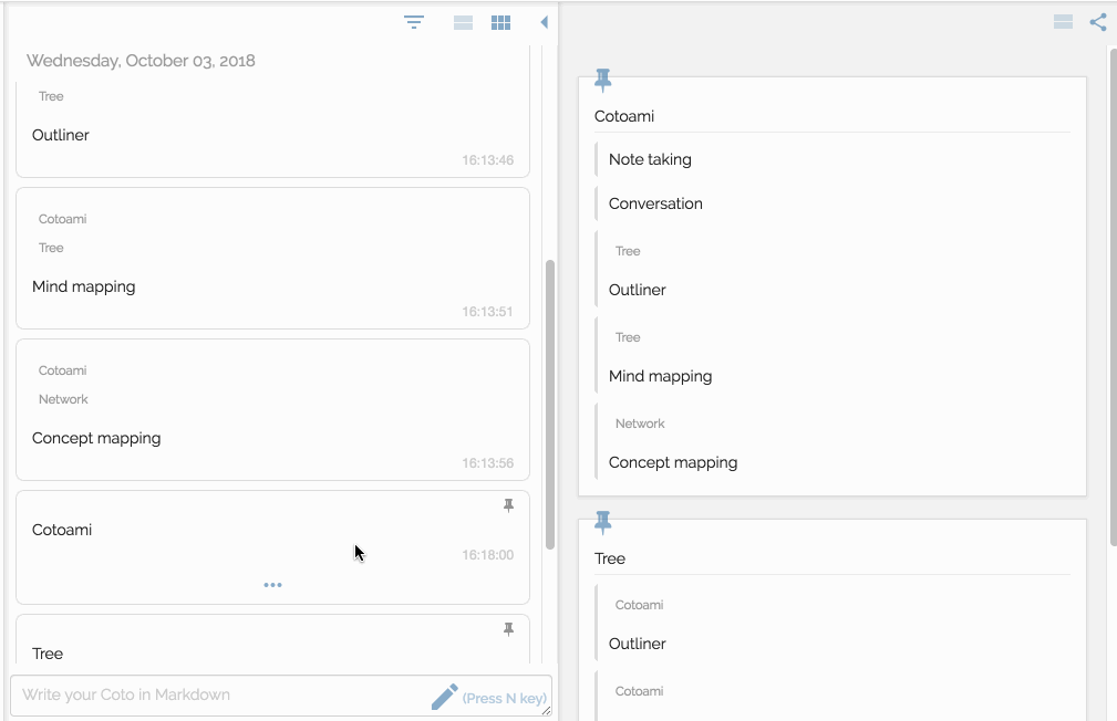 Flow is an unstructured stream of posts arranged in chronological order, where you can casually throw in any information without hesitation. From there, you can pin items that matter to you and collect them in the Stock on the right, gradually building a structured knowledge base. This is the basic way to use Cotoami.