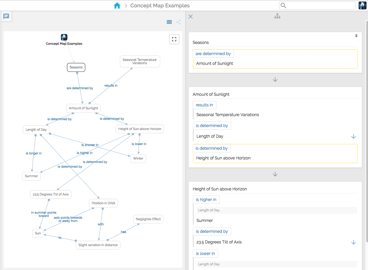 The above concept map explains why we have seasons (the original concept map is presented in the article at Concept Maps official website: http://cmap.ihmc.us/docs/theory-of-concept-maps). If you are interested in how this concept map was created with Cotoami, here is a youtube video to demonstrate the process: